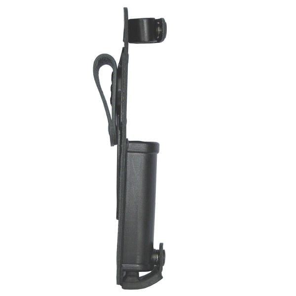This baton holder benefits from the secure 360 degree adjustable carriage coupled with a right and left thumb release, essential for ease and speed of withdrawal or relocation. It prevents any accidental or involuntary expansion of the holder but does permit the user to carry it while expanded.