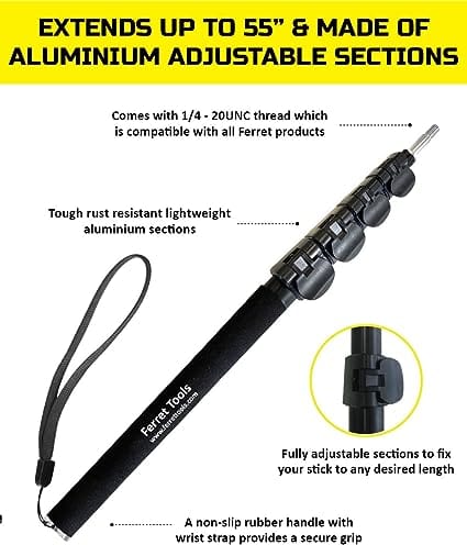 It provides extended reach up to 55” (140cm) in length that allows you to see and reach where you can’t. It has a 1/4” 20UNC thread, which is compatible with all Ferret products. Work Safer. Work Smarter.