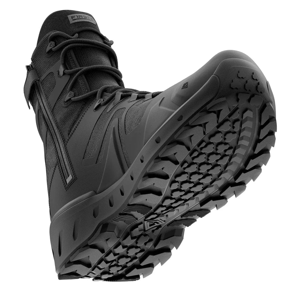 Introducing the First Tactical Men's 8" AERO-TAC Side-Zip Black Police Boots - engineered for professionals who demand agility, durability, and comfort during extended shifts. Weighing a mere 450g a pair (15.5 ounces), these boots are among the lightest in their class, offering running-shoe comfort without compromising on tactical performance.