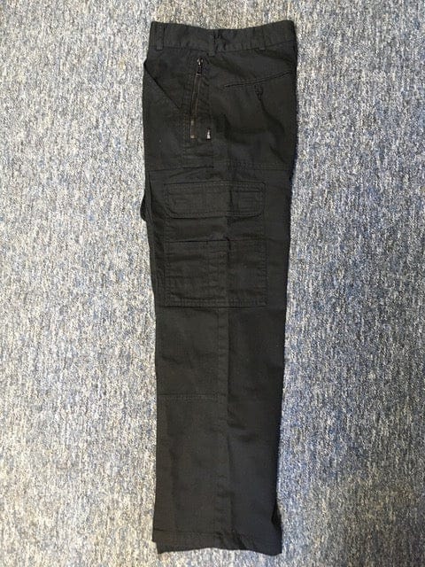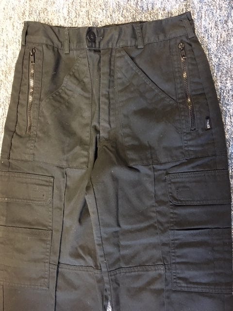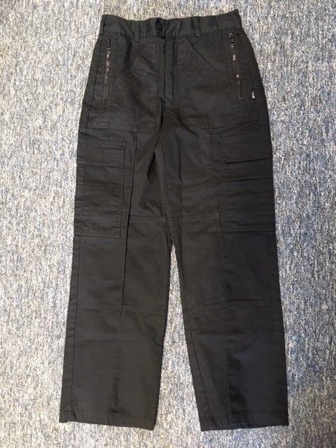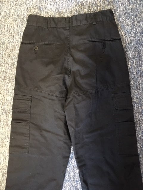 Combat Trousers Men’s, black (Used Grade A), two zip front pockets, cargo leg pockets with flap, two back pockets with button fastening, stitched front seam, POLICE label hip seam, belt loops.