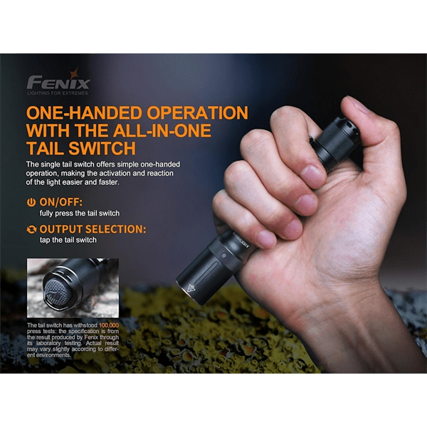 The Fenix torch features four brightness levels, ranging from 5 to 350 lumens. All the modes are accessed by a single, all-in-one tailswitch for simple, one-handed use.