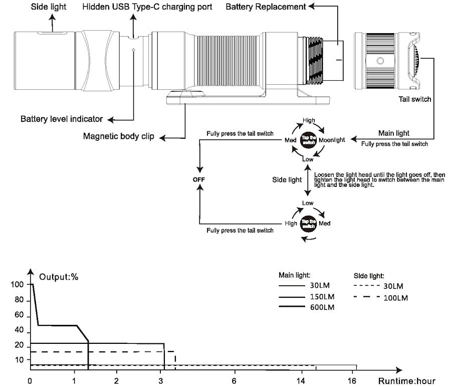 With the light switched on, loosen the light head until the light goes off, then tighten the light head again to switch between the main light and the side light.