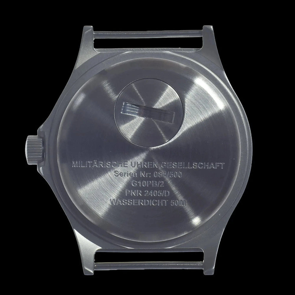 This MWC G10 model is a direct descendant of the G10 watches we produced in the 1980s. It retains the popular battery hatch, a feature many other military watch manufacturers have since abandoned. Originally, the battery hatch was essential because early quartz watch batteries lasted only about a year. Nowadays, the battery in this watch lasts around five years, making the hatch more of a design feature than a necessity, though it remains popular for its historical significance.