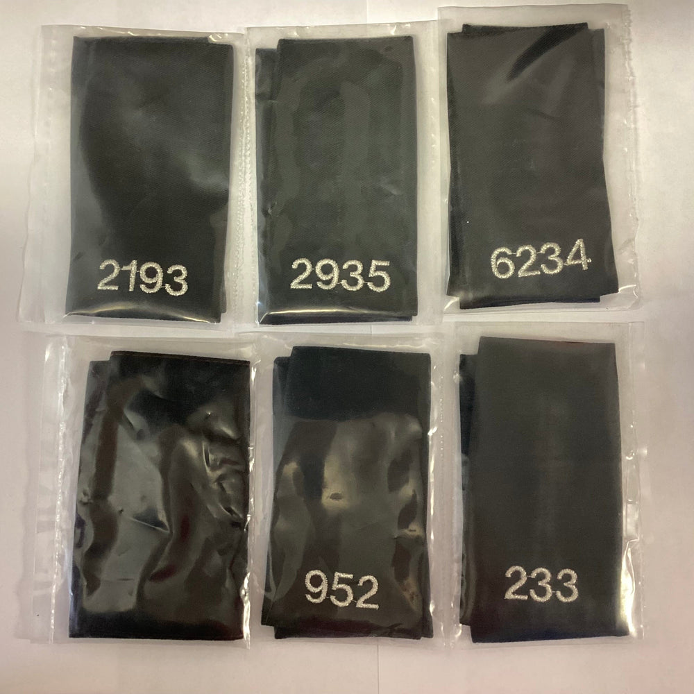 Epaulette Slides, black with silver embroidered mixed numbers and lengths (Used – Grade A), sold in pairs, designed for the shoulders of shirts, vests and jackets.