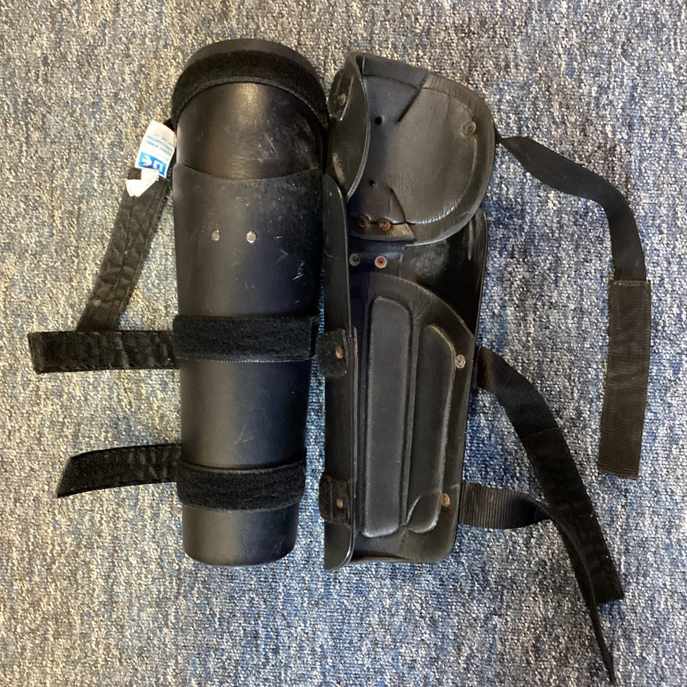 Knee Shin Pads, plain surface (Used - Grade A), 2 – piece articulated, plain surface exterior, padded interior, leather hinge, three straps to secure around leg with Velcro fastening.