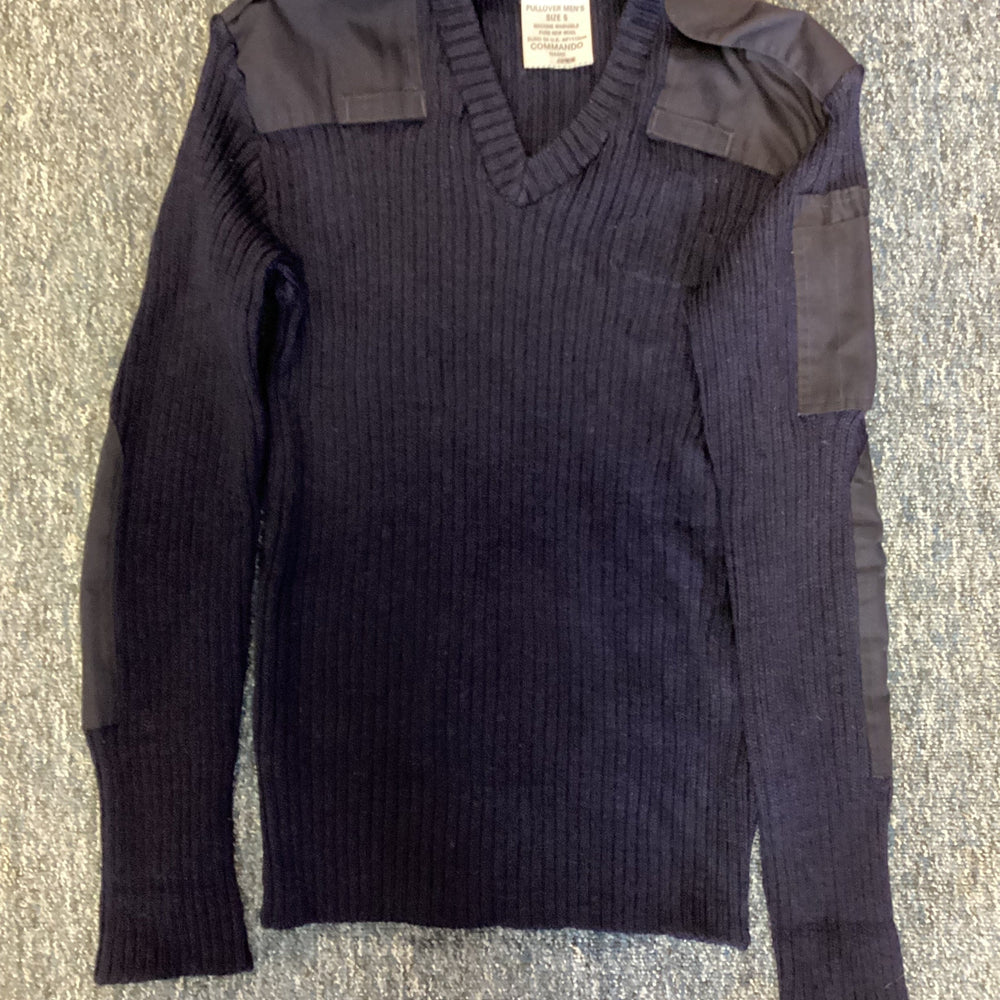Navy Nato Jumper Men’s (Used - Grade A), ribbed long sleeve V neck jumper, epaulette slides, radio loops, shoulder and arm patches, pen pocket on sleeve, styles will vary.